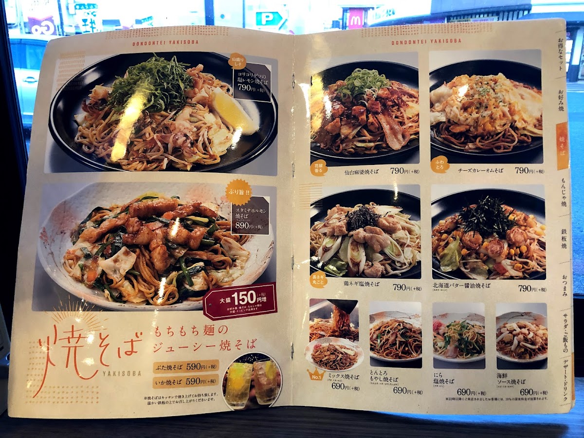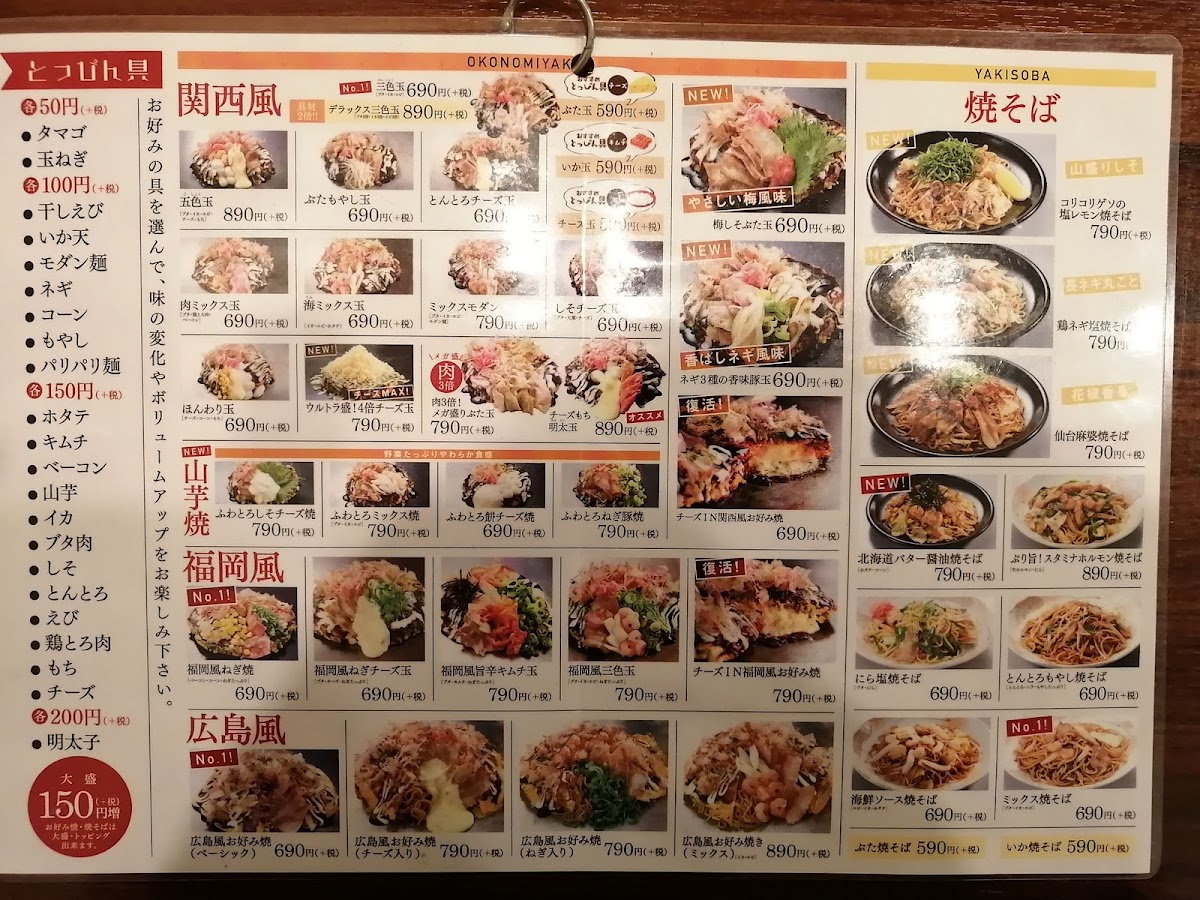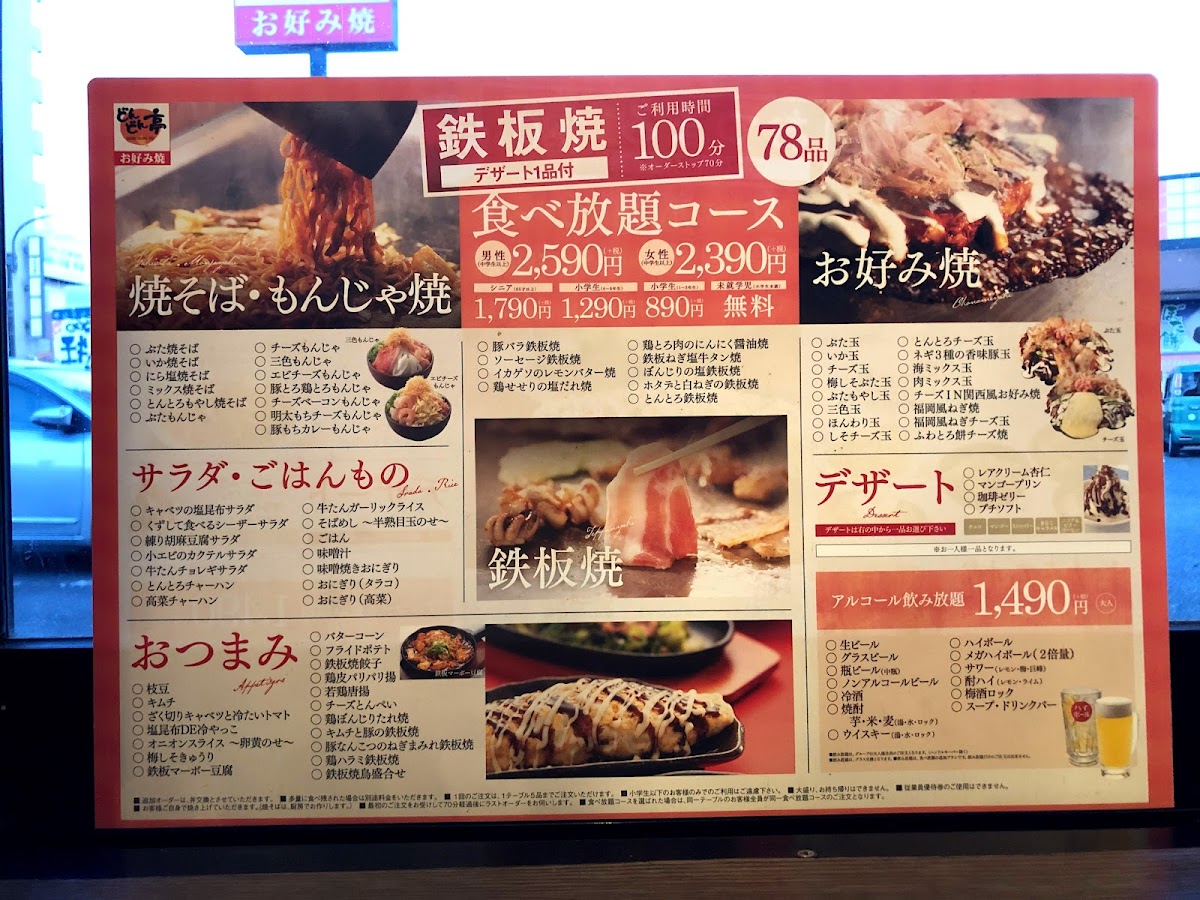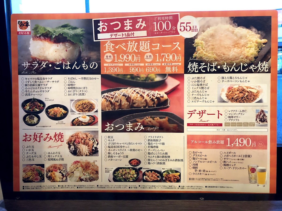 From a reviewer’s perspective, the menu at Dondon-Tei Jinyama offers a focused selection of Kansai-style okonomiyaki and yam-based specialties that highlight both indulgence and lighter options. The Kansai-style okonomiyaki section features items like 三色玉 and 肉3倍!メガ盛りぶた玉, which showcase classic flavors with hearty portions, especially appealing for those who enjoy rich, savory pancakes packed with ingredients. For diners looking for something a bit different, the yam-based dishes provide a softer texture and a lower-carb alternative, with options such as ふわとろもちチーズ焼 that emphasize a fluffy, melty consistency and comforting cheese flavor. Overall, the menu may not be extremely large, but it focuses on signature dishes done well, giving customers a clear choice between traditional okonomiyaki and the lighter yam-based variations, making it easy to find something satisfying depending on appetite and preference.